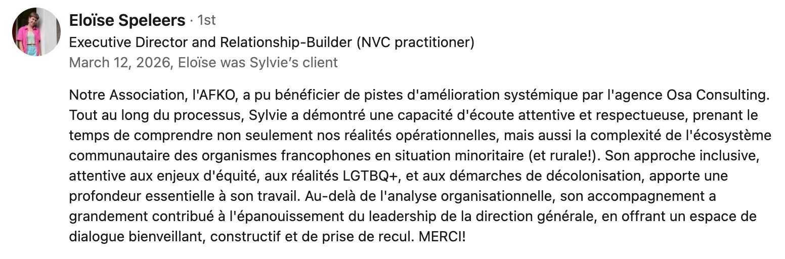 Notre équipe multilingue est spécialisée en stratégie, gestion de projet, recherche-création, communications et conception de formations. Qu’il s’agisse de créer des environnements d’apprentissage justes, de cartographier des réseaux ou de concevoir des cadres de résilience, nous plaçons la justice au centre. L'agence Osa Consulting est co-fondée et dirigée par deux personnes-entrepreneuses aux expertises complémentaires qui apportent leur savoir-faire - et leur touche de magie - à chaque projet.